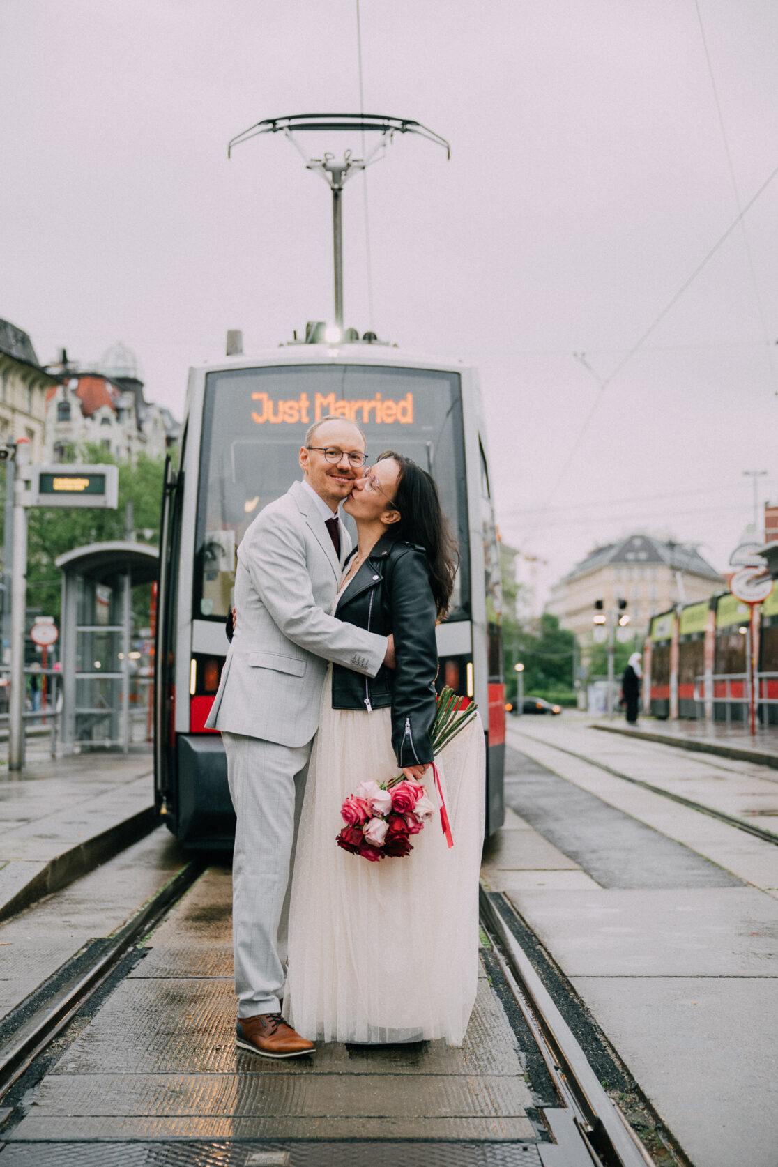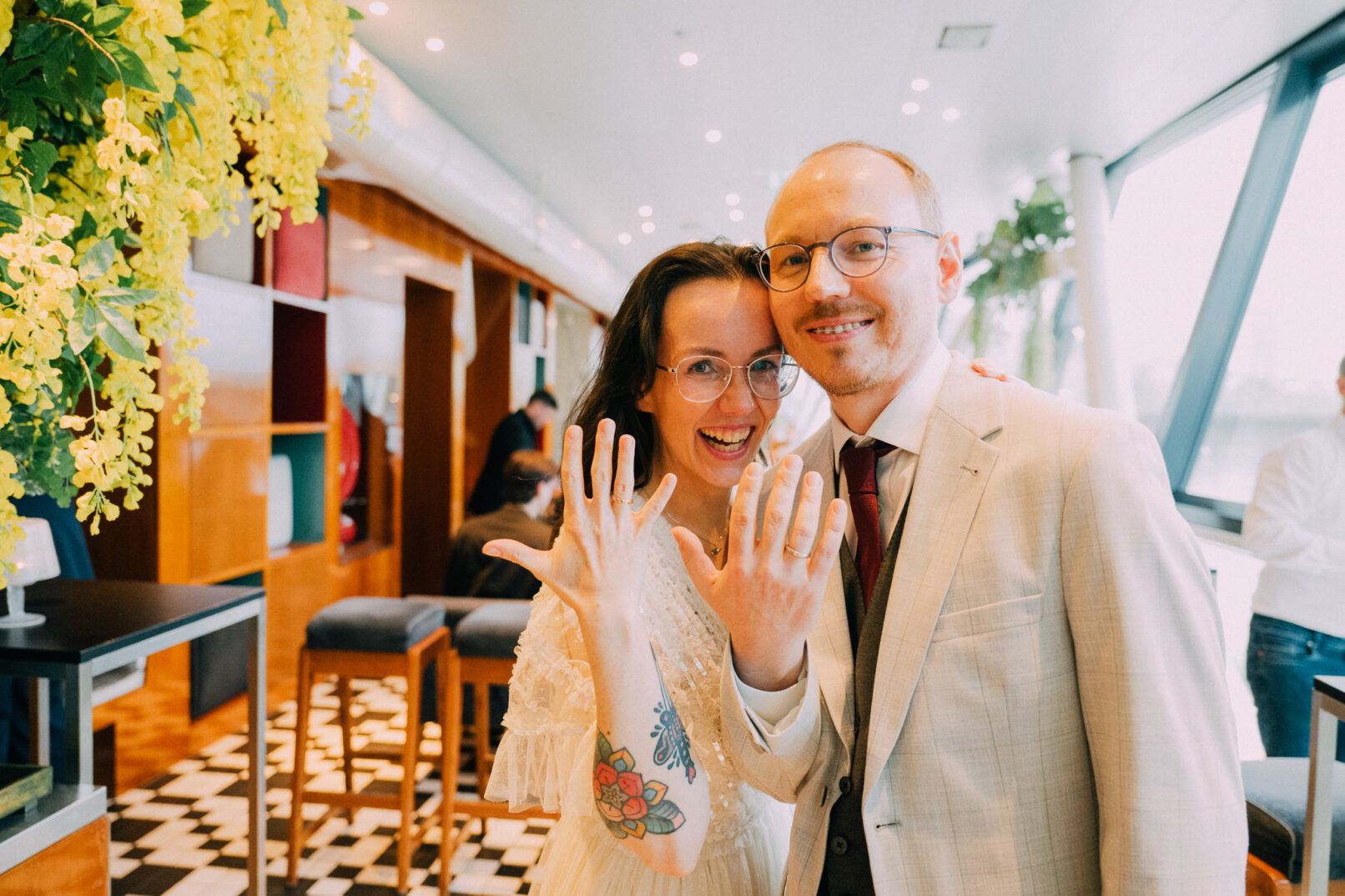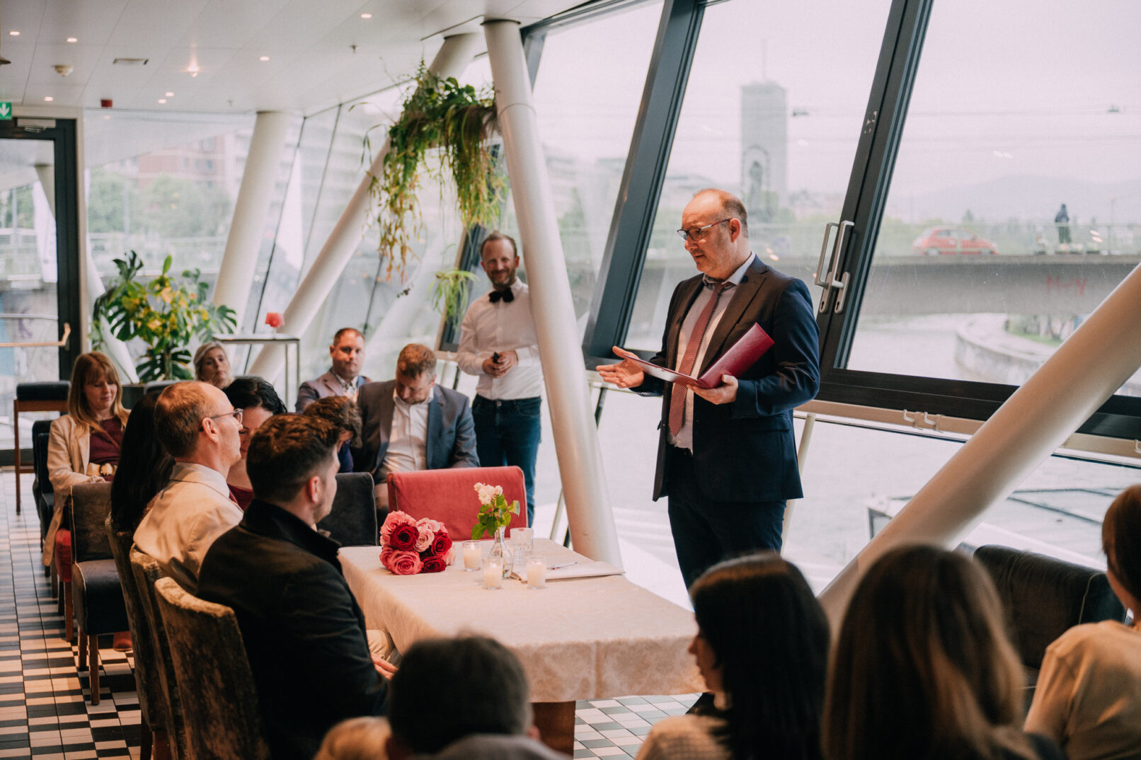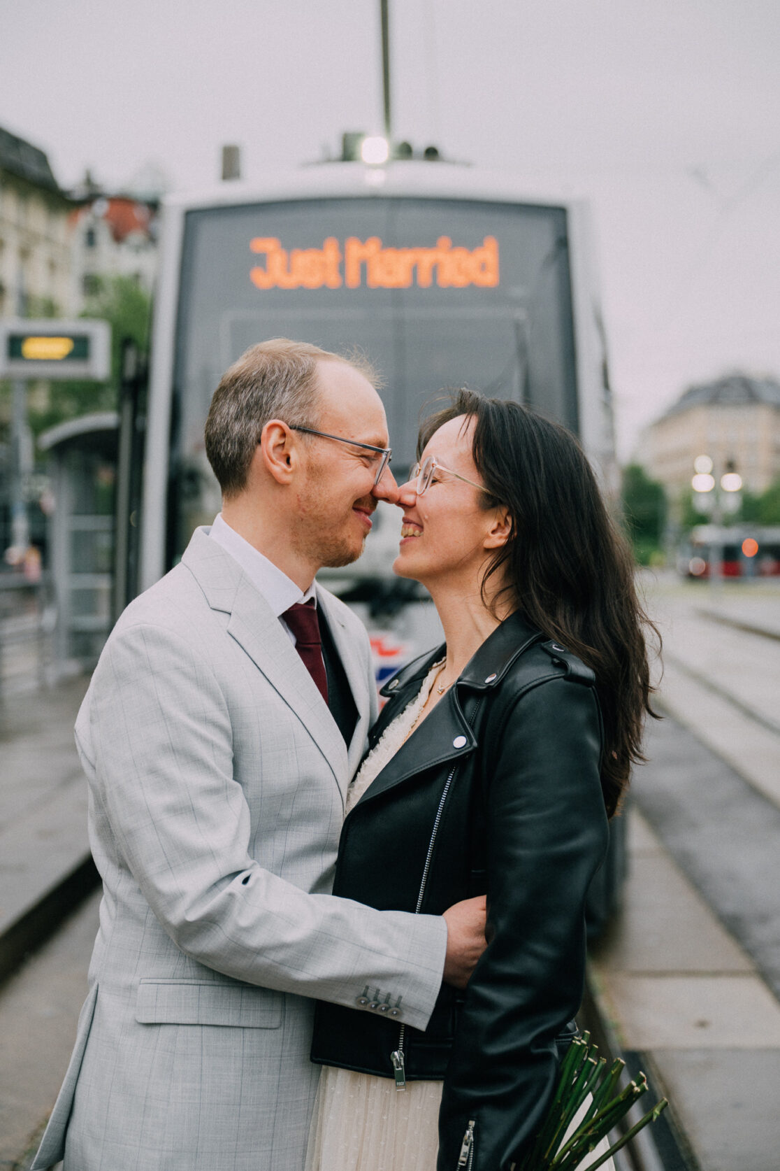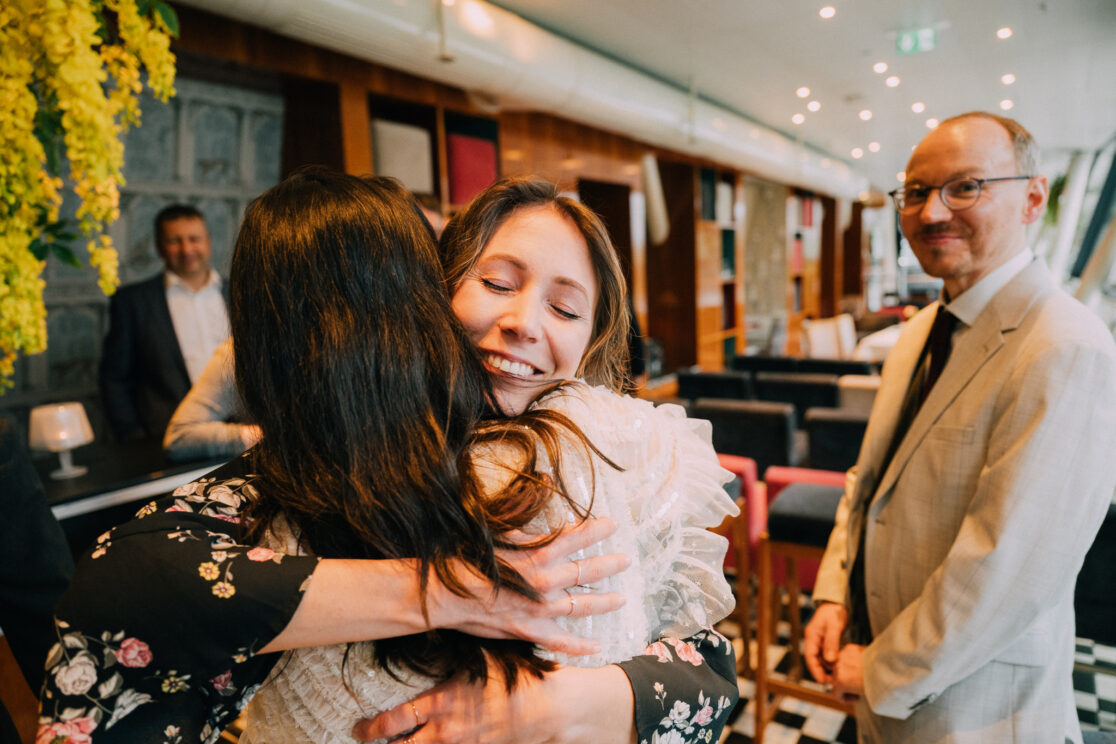 Der Tag mit P & G hat bei ihren gemeinsamen Vorbereitungen in ihrer Wohnung begonnen, bevor wir bei erfrischenden Temperaturen zu einer kurzen Fotorunde in ihrem Grätzel gestartet sind. Nachdem alle wieder trocken und warm waren, gings zur standesamtlichen Trauung mit Freunden und Familie ins Motto am Fluss, noch Zentraler kann man in Wien eigentlich gar nicht heiraten. Frisch verheiratet durfte die Hochzeitsgesellschaft dann mit einer privaten Bim (Straßenbahn für die nicht-Wiener) zum Dinner fahren, aber sehr am besten selbst…..