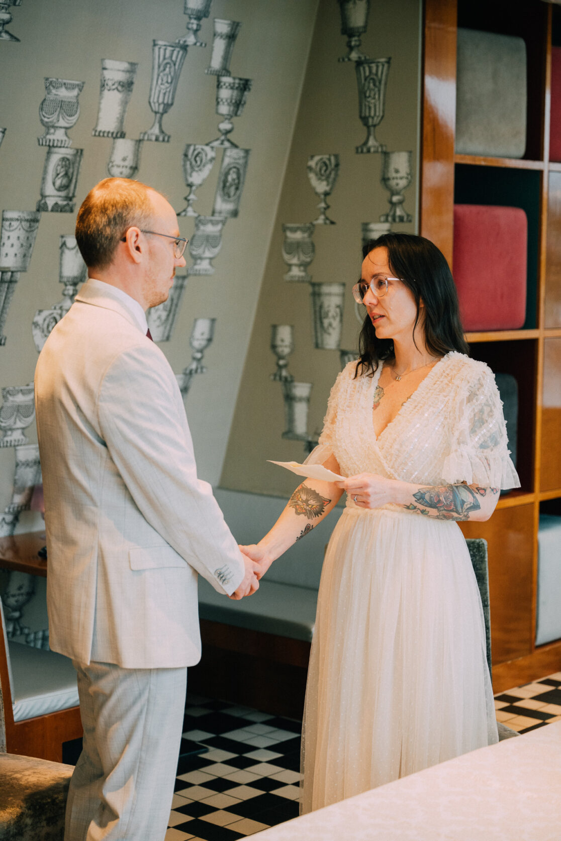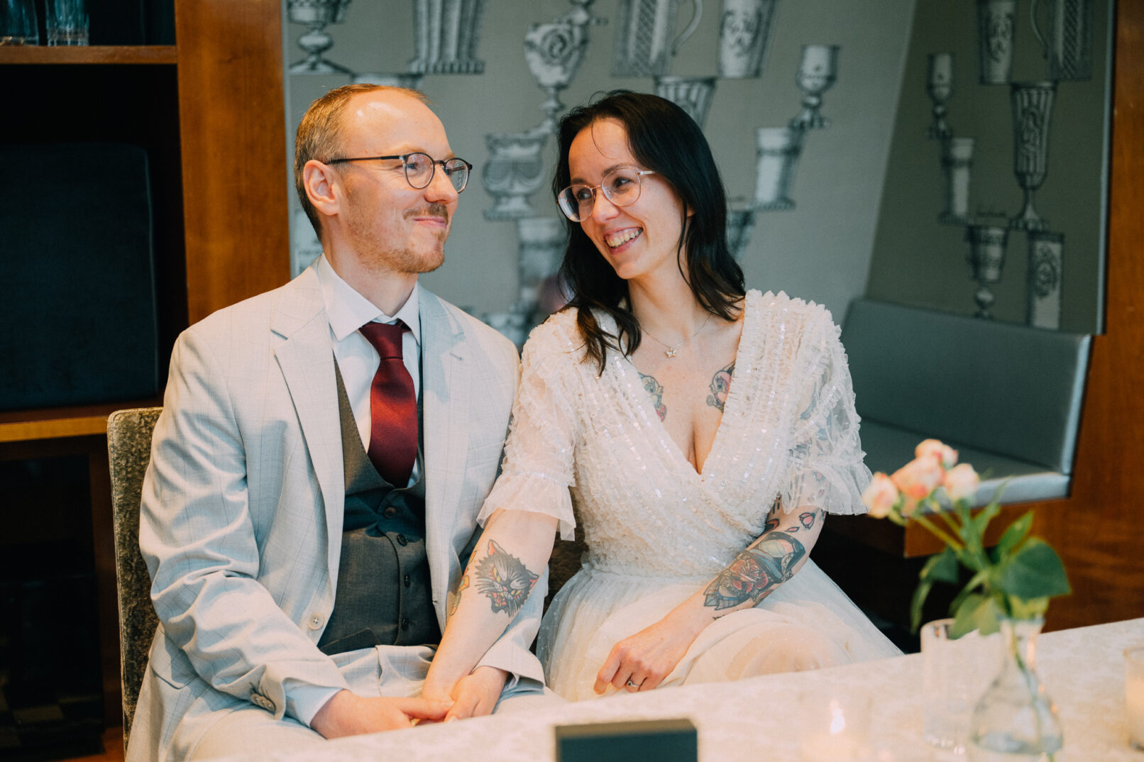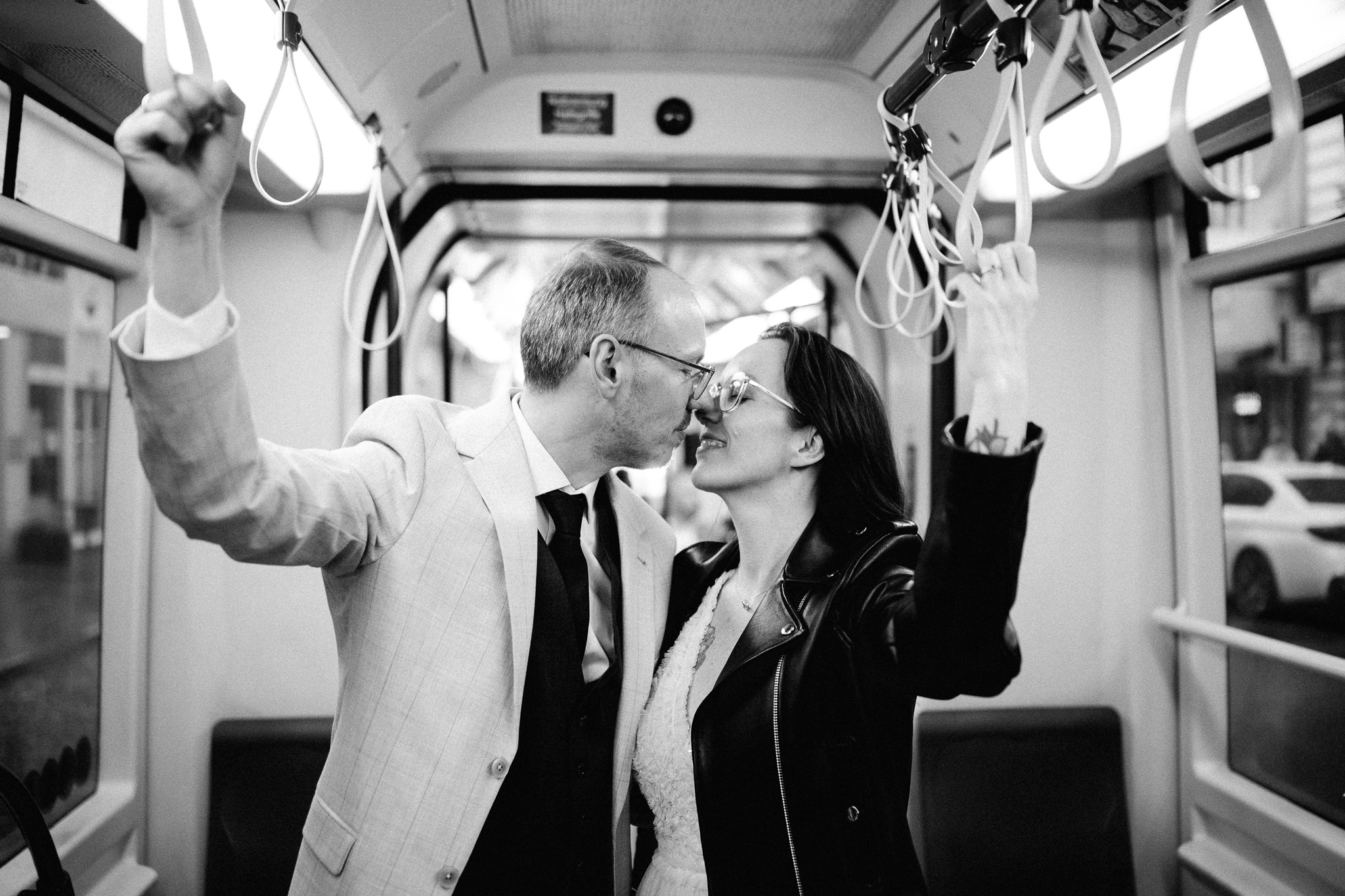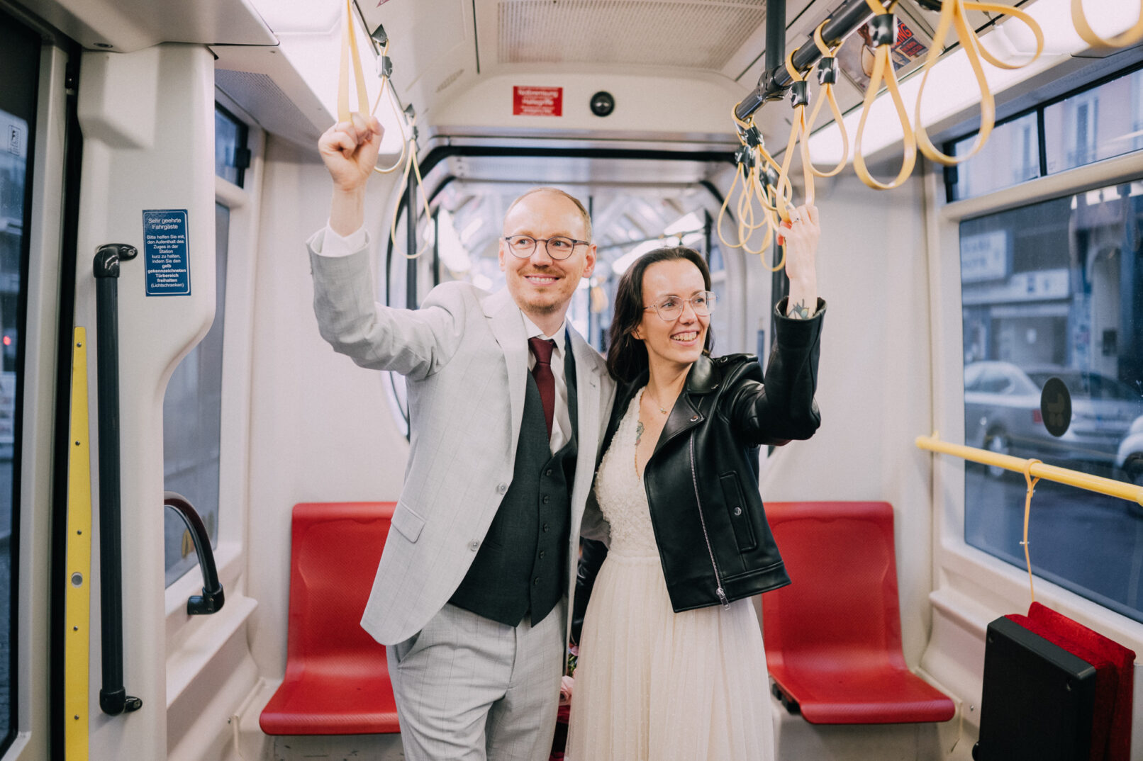 Der Tag mit P & G hat bei ihren gemeinsamen Vorbereitungen in ihrer Wohnung begonnen, bevor wir bei erfrischenden Temperaturen zu einer kurzen Fotorunde in ihrem Grätzel gestartet sind. Nachdem alle wieder trocken und warm waren, gings zur standesamtlichen Trauung mit Freunden und Familie ins Motto am Fluss, noch Zentraler kann man in Wien eigentlich gar nicht heiraten. Frisch verheiratet durfte die Hochzeitsgesellschaft dann mit einer privaten Bim (Straßenbahn für die nicht-Wiener) zum Dinner fahren, aber sehr am besten selbst…..