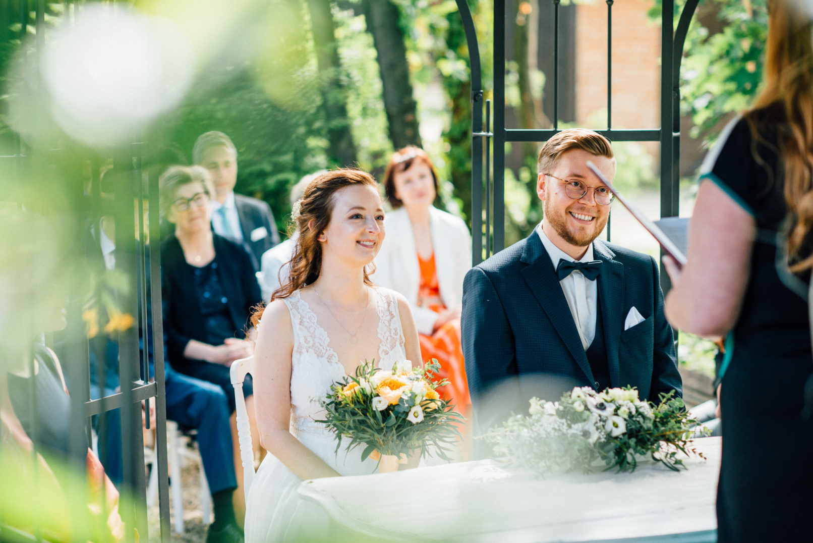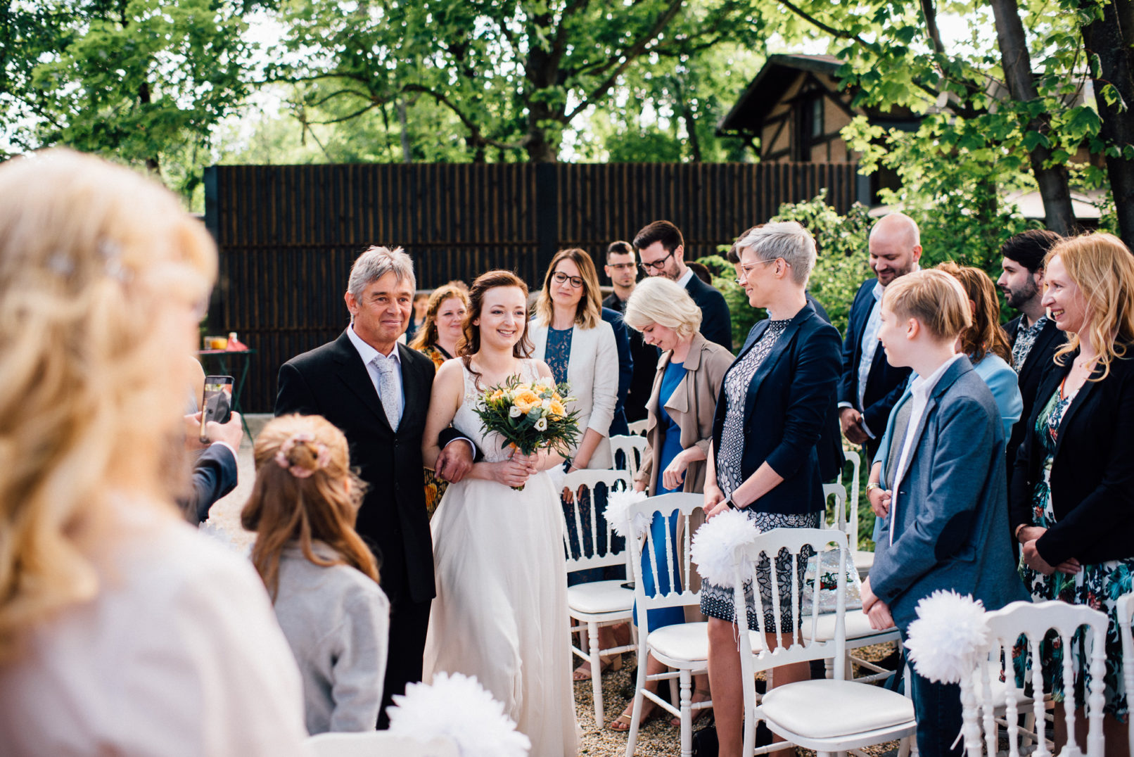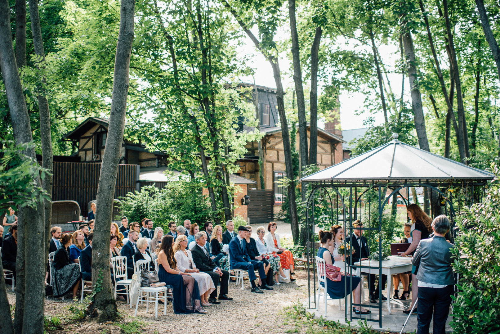 Für die Trauung haben sich die beiden für das Concordia Schlössl in Simmering entschieden. Eine leicht skurrile aber liebevolle Hochzeitslocation bis zur Decke gefüllt mit Geschichte. Wo früher noch die K.u.K. Hof-Steinmetze gehämmert haben, lädt der kleine Garten hinter dem hölzernen Bau heutzutage zum entspannten Feiern ein.